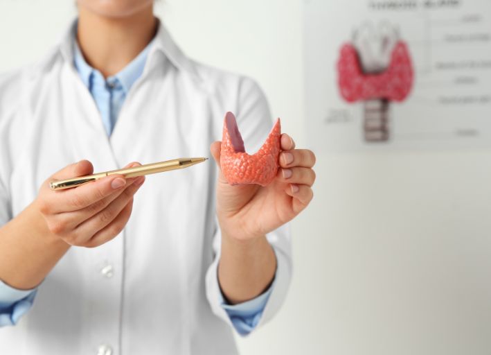La tiroides es una glándula pequeña con forma de mariposa que está ubicada en la parte delantera del cuello, justo debajo de la nuez de Adán.